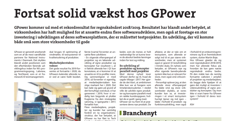 I den fjerde udgave af Aktuel Elektronik 2020 finder du en historie om GPower på side 2. En historie, som tager afsæt i et rekordresultat for regnskabsåret 2018/2019, der blandt andet har betydet, at vi har haft mulighed for at ansætte endnu flere softwareudviklere, men også at foretage en stor investering i udviklingen af vores […]
